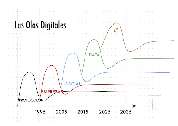 ¿En qué punto estamos? ¿Cuánto queda de revolución digital? ¿Estamos al principio? ¿Esto acabará en unos pocos años? Mi sensación es que no tenemos un mapa que nos oriente y creo que ante tal avalancha de información es difícil entender la dimensión de lo que viene por delante.Para ello propongo, con toda la humildad del mundo, intentar reflejar en un esquema visual, soportado por una cierta base técnica, lo que yo pienso que ocurrir en los próximos años. Para ello hablaremos de la ola digital.