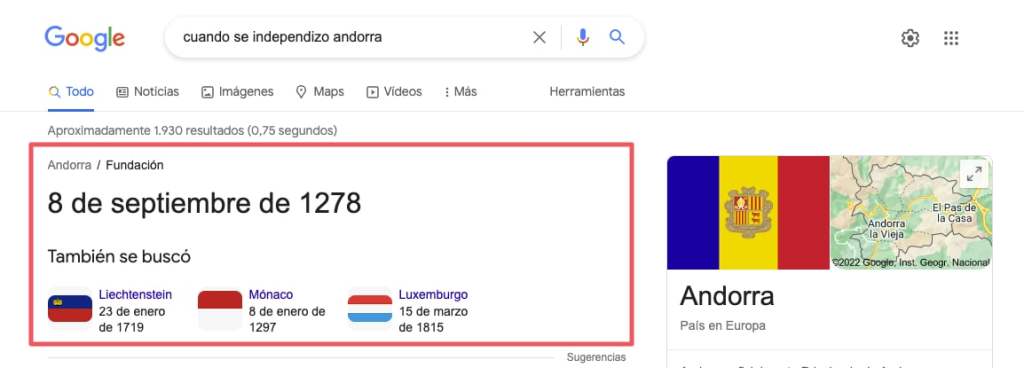 Esta es la funcionalidad que más beneficios nos va a aportar, ya que Google incluye a nuestro resultado una amplia descripción, una imagen y aparece encima de todos los resultados orgánicos, destacando respecto al resto de resultados.